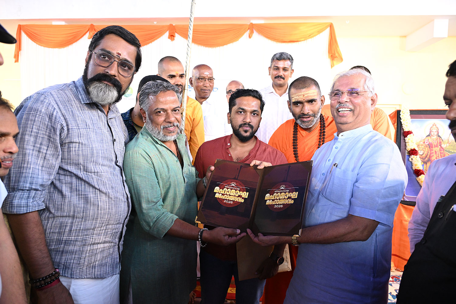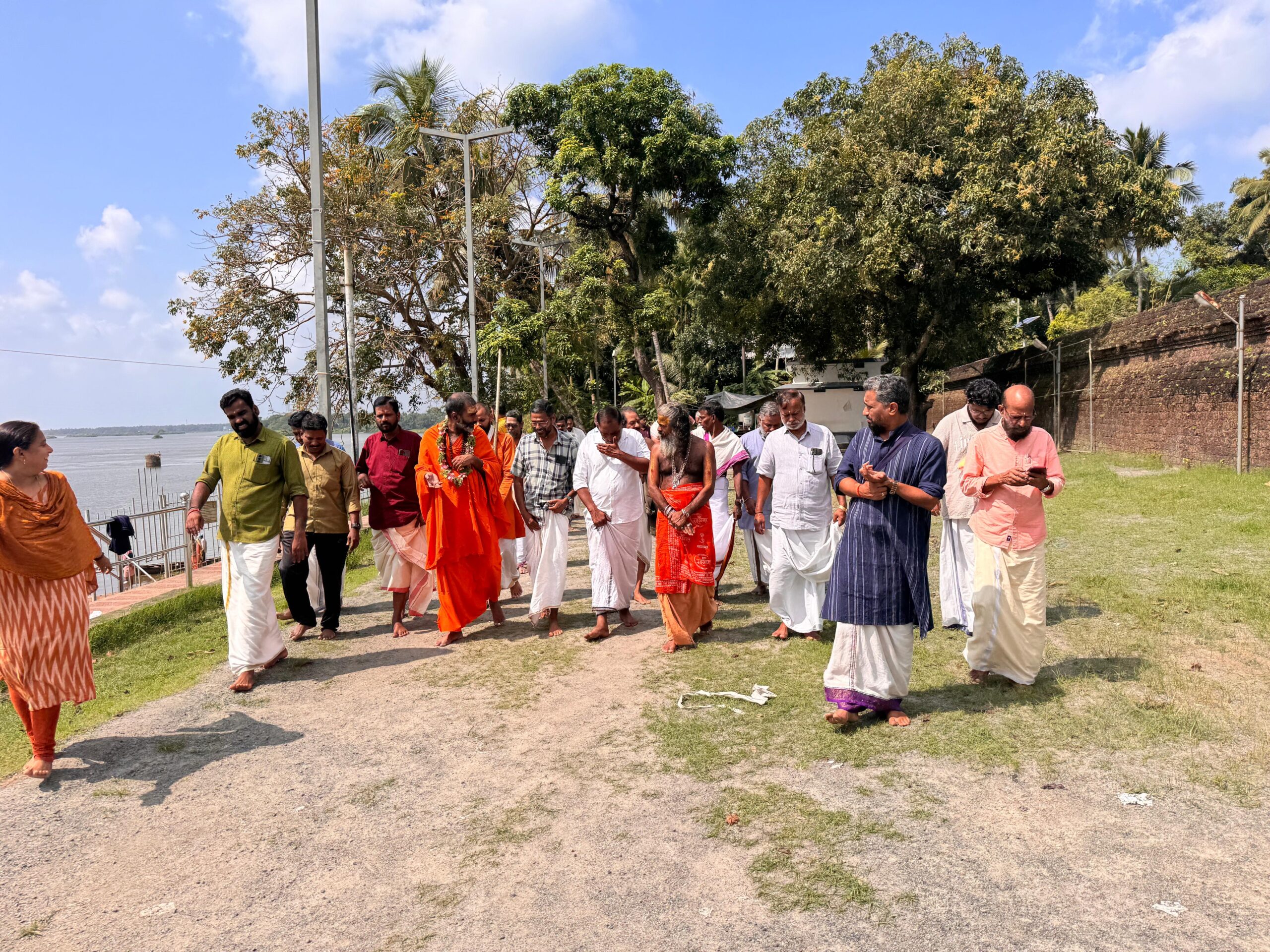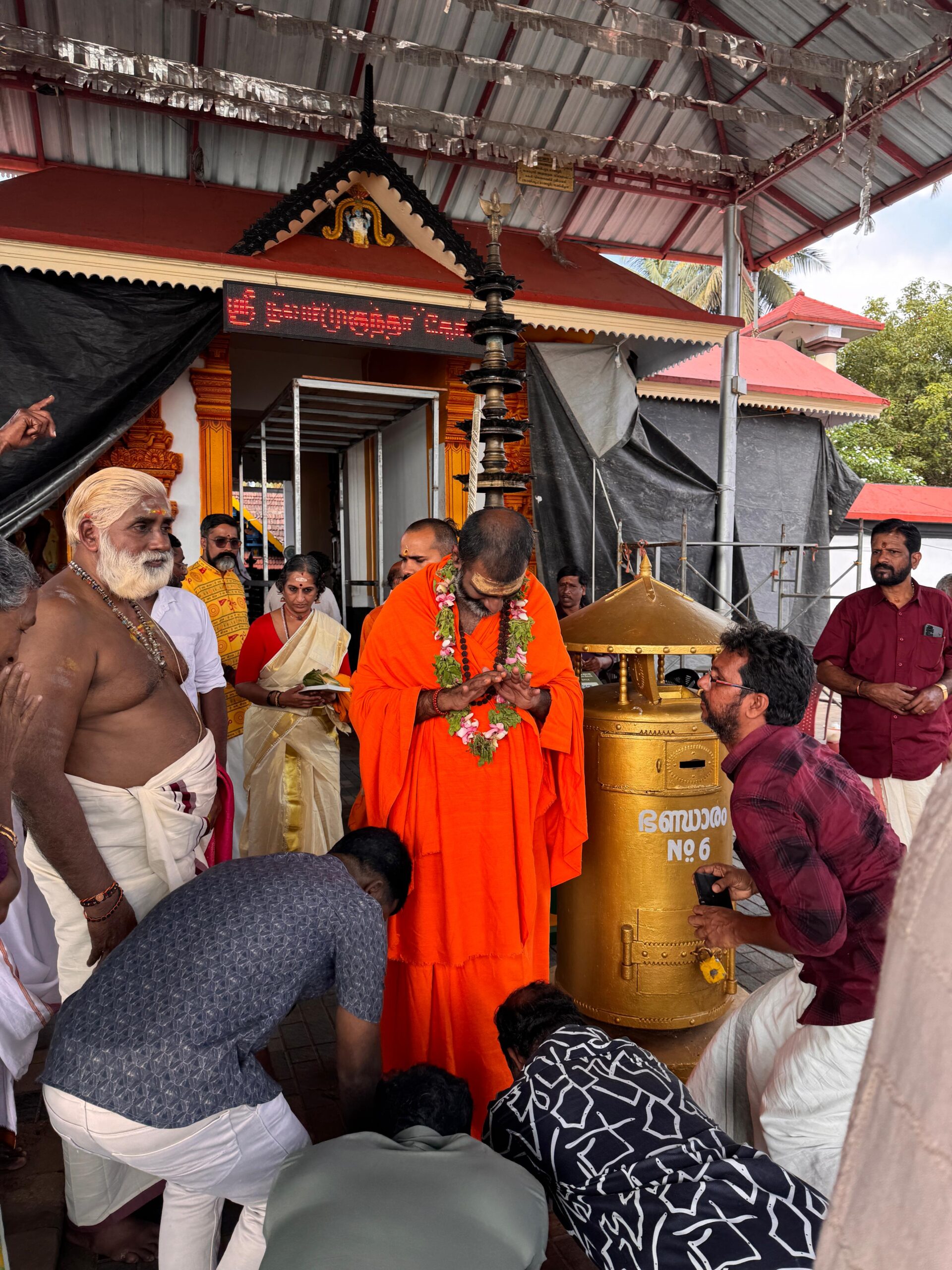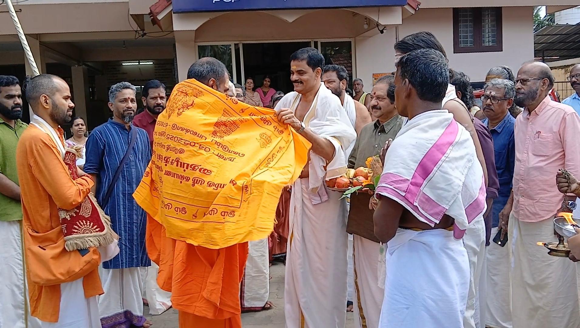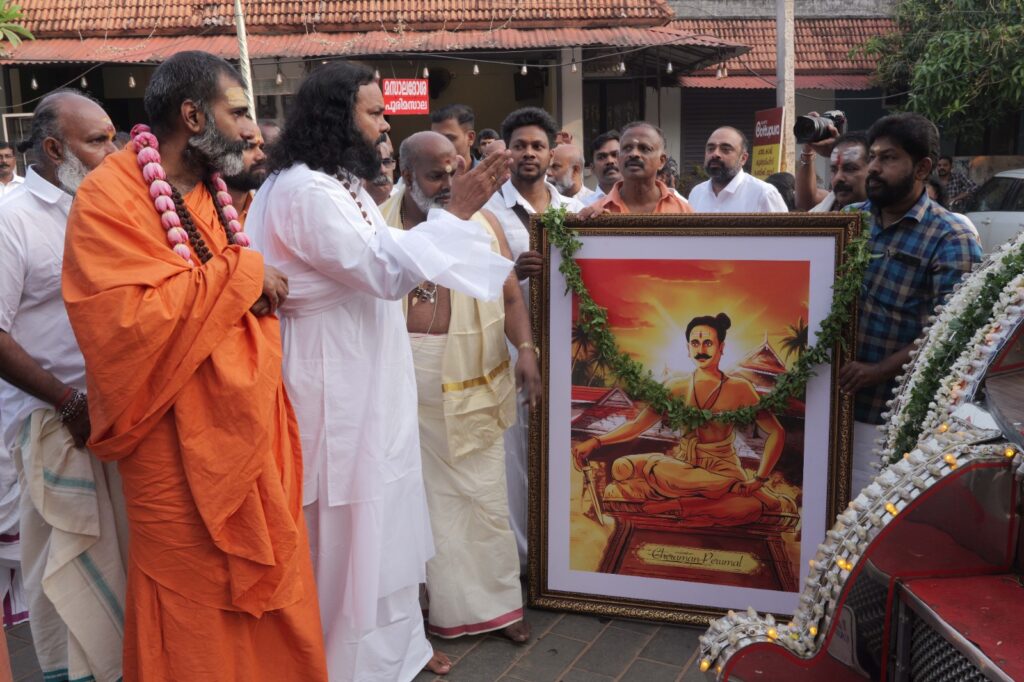 ധർമ്മ ജ്യോതി രഥയാത്രയോടനുബന്ധിച്ച് തിരുവഞ്ചിക്കുളം ക്ഷേത്രത്തിൽ ചേരമാൻ പെരുമാൾ നായനാരുടെ ഛായാചിത്രം മഹാമണ്ഡലേശ്വർ ആനന്ദവനം ഭാരതി മഹാരാജ് അനാഛാദനം ചെയ്യുന്നു.